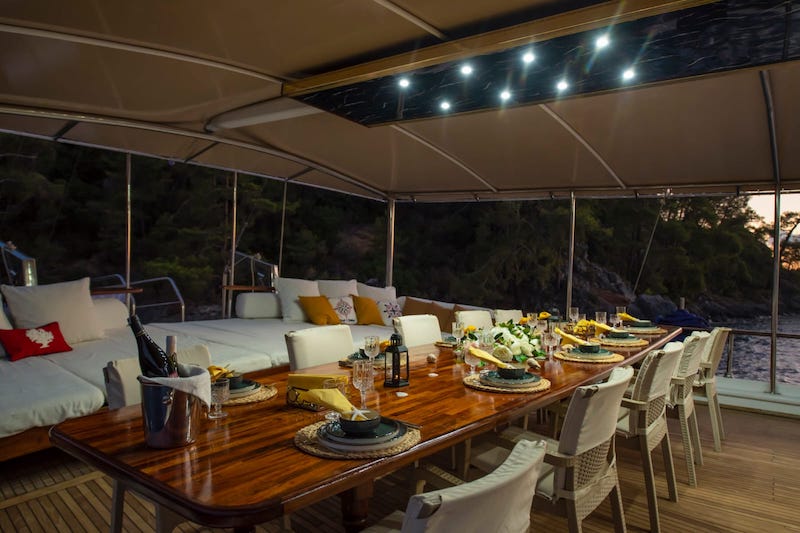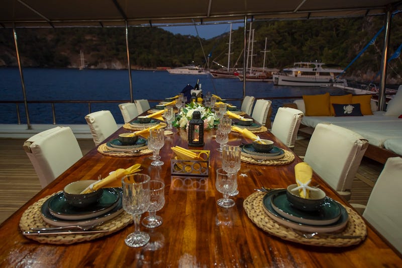 Teknemizin ana yemek masası arka güvertededir. Yağışlı ve serin havalarda salonda yer alan masa da kullanılır.
