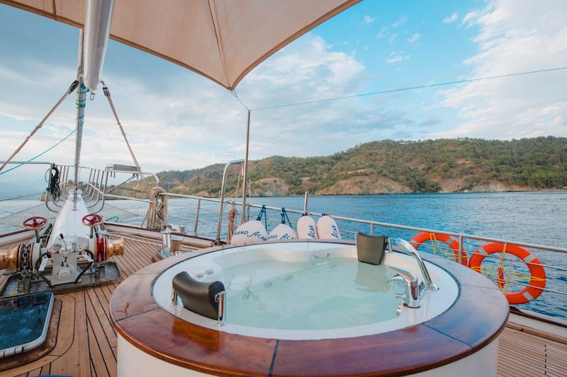 8 kamaralı tekneler arasında açık ara daha geniş kamara ve güverte yaşam alanları sağlayan lüks mavi yolculuk teknemizde sizlerin keyifli zaman geçirmesi için çabalayan 6 kişilik mürettebat bulunmaktadır.